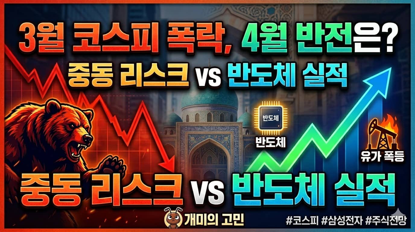 최근 3월 한 달간 개인 투자자들이 수십 조원을 투입하며 코스피 시장을 지탱하려 노력했지만, 결국 지수가 무너지는 모습을 보였습니다. 대체 시장에 어떤 일이 있었던 것인지, 그리고 4월 반도체 실적 시즌을 앞둔 지금 우리가 주목해야 할 포인트는 무엇인지 정리해 드립니다. 1. 3월 코스피 하락의 결정적 원인 : 중동 리스크와 유가 폭등3월 내내 이어진 하락세의 중심에는 중동 전쟁 확전 우려가 있었습니다.유가 폭등과 인플레이션 : 전쟁 우려로 인해 국제 유가가 급등하면서 잠잠해지던 인플레이션 공포가 다시 살아났습니다.안전 자산 선호 현상 : 시장의 불안감이 커지자 투자자들은 위험 자산인 주식 대신 안전 자산인 달러로 몰리기 시작했습니다.외국인 자금 이탈 : 달러 강세 속에 외국인 투자자들은 코스피 시장에..